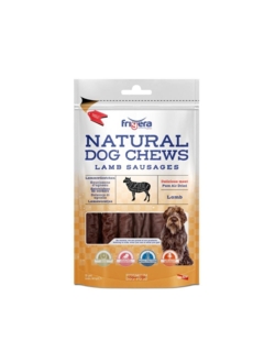 Frigera Natural Dog Chews Lamb Sautage. Lækre lammepølser der er lavet af omhyggeligt udvalgt og lækkert kød. De har højt indhold af proteiner og giver hunden værdifuld energi til dens næste eventyr. I modsætning til de mange tørre godbidder på markedet er disse pølser mere tilbøjelige til at tilfredsstille hundens appetit på grund af deres forhøjede fugtighedsindhold. Dette gør pølserne lidt blødere og letter frigivelsen af smagene indeni. Da pølserne let kan opdeles i mindre stykker, er de ideelle som en udsøgt træningsgodbid til hunde i alle størrelser.
