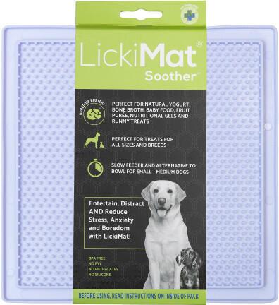LickiMat Soother is an activity mat with small rubber pads that the dog can lick up food from. Fill the LickiMat Soother with delicious things such as yogurt, peanut butter, cottage cheese, blended fruit and vegetables, raw food, pâté or wet food. Freeze it before use to make the activity mat last even longer. Make sure the food is well pressed into the mat before you give it to your dog or puppy.