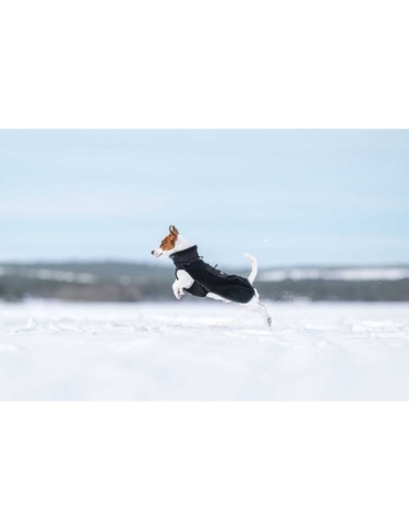 The soft pile jacket feels nice against the dog's body. A well-fitting dog jacket inspired by Rukka's sports vest for humans to keep the dog warm in cool weather conditions. The excellent cut of the fleece jacket adapts to the dog's movements making it almost unnoticeable. Therefore, the garment is perfect for a dog that is not used to wearing clothes. The jacket has a high, warming collar and a leash opening on the back. A well-cut hem keeps the dog's bigger muscle groups warm. The adjustable elastic rear leg straps ensure that the jacket stays in place in all conditions, as well as in activities of higher intensity. The machine-washable garment dries fast. The jacket's edging has a reflective binding.