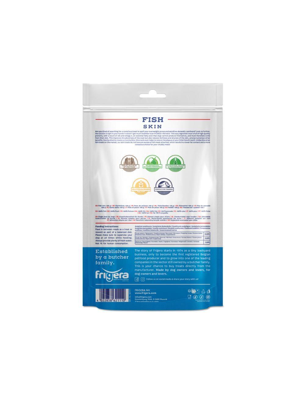 Fiskeskindet er blidt tørret for at skabe en sprød godbid, som også kan hjælpe med at reducere plak på hundens tænder. I modsætning til andre fiskegodbidder på markedet har Frigera fiskeskind ikke et overskud af fedtholdigt kød, hvilket resulterer i et lavere fedtindhold.
