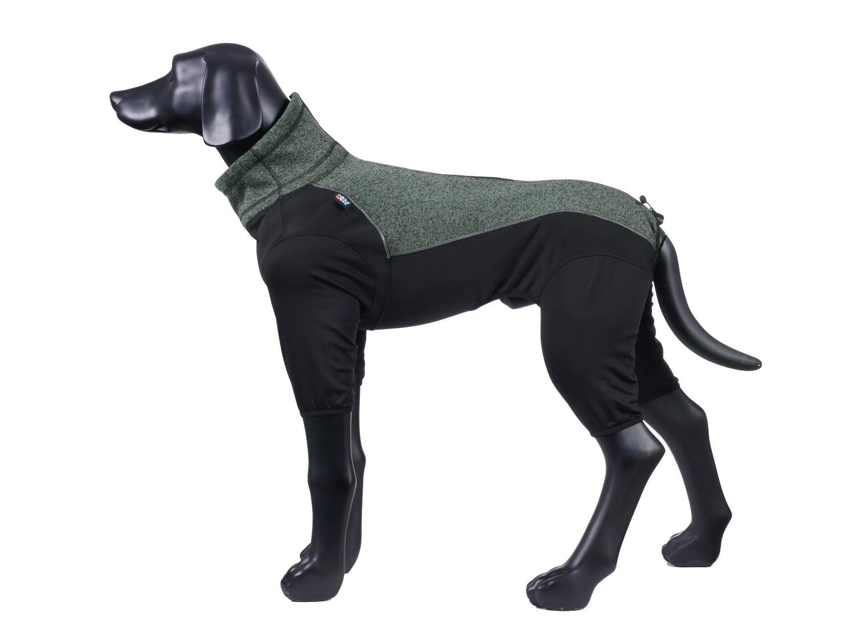 En velsiddende fleece-overall, der holder hunden varm i køligt vejr. Overallen, der er lavet af en kombination af tekniske materialer, er let at have på. Rygpanelet er lavet af marmoreret strik, og underpanelet og benene er af ekstremt elastisk trikotstrik med en glat overflade. Begge materialer har et blødt, børstet indre. Overallens fremragende snit tilpasser sig hundens bevægelser, hvilket gør den næsten usynlig. Derfor er beklædningsgenstanden perfekt til en hund, der ikke er vant til at have tøj på. Materialet i underpanelet er praktisk: stænk er nemme at tørre af, og den tørrer hurtigt. Takket være lynlåslukningen på ryggen er overallen hurtig og nem at tage på. En justerbar halsudskæring og krave giver det sidste touch for perfekt pasform og beskyttelse. Beklædningsgenstanden har en reflekterende kant syet oven på de vigtige sømme. Funktioner: Ekstremt behagelig at have på, strækbar. Reflekterende detaljer. Tørrer hurtigt. Beskyttende, justerbar krave. Lynlåslukning. Varmt og åndbart materiale. Elastisk kant i begge ben.